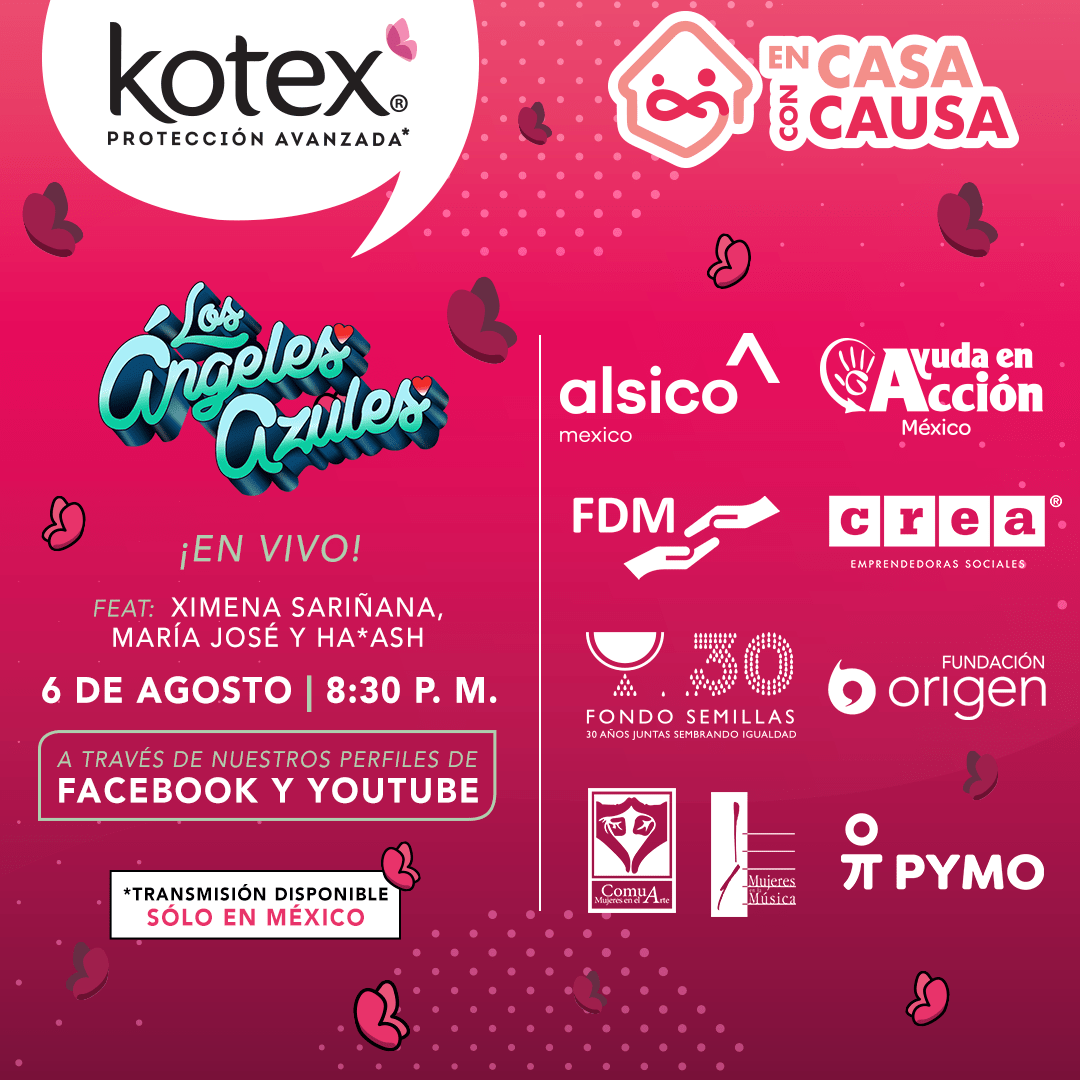 Tenemos el honor de invitarte al Concierto virtual que ofrecerán el día de mañana Los Ángeles azules, en apoyo a la causa de las mujeres. Gracias a esta iniciativa de Kotex de México, crearemos mecenazgos para las artistas y apoyaremos especialmente a aquellas que viven en situación de pobreza y marginación, como es el caso de las comunidades indígenas. Te invitamos a formar parte de nuestra campaña y a sumarte. En casa con causa.