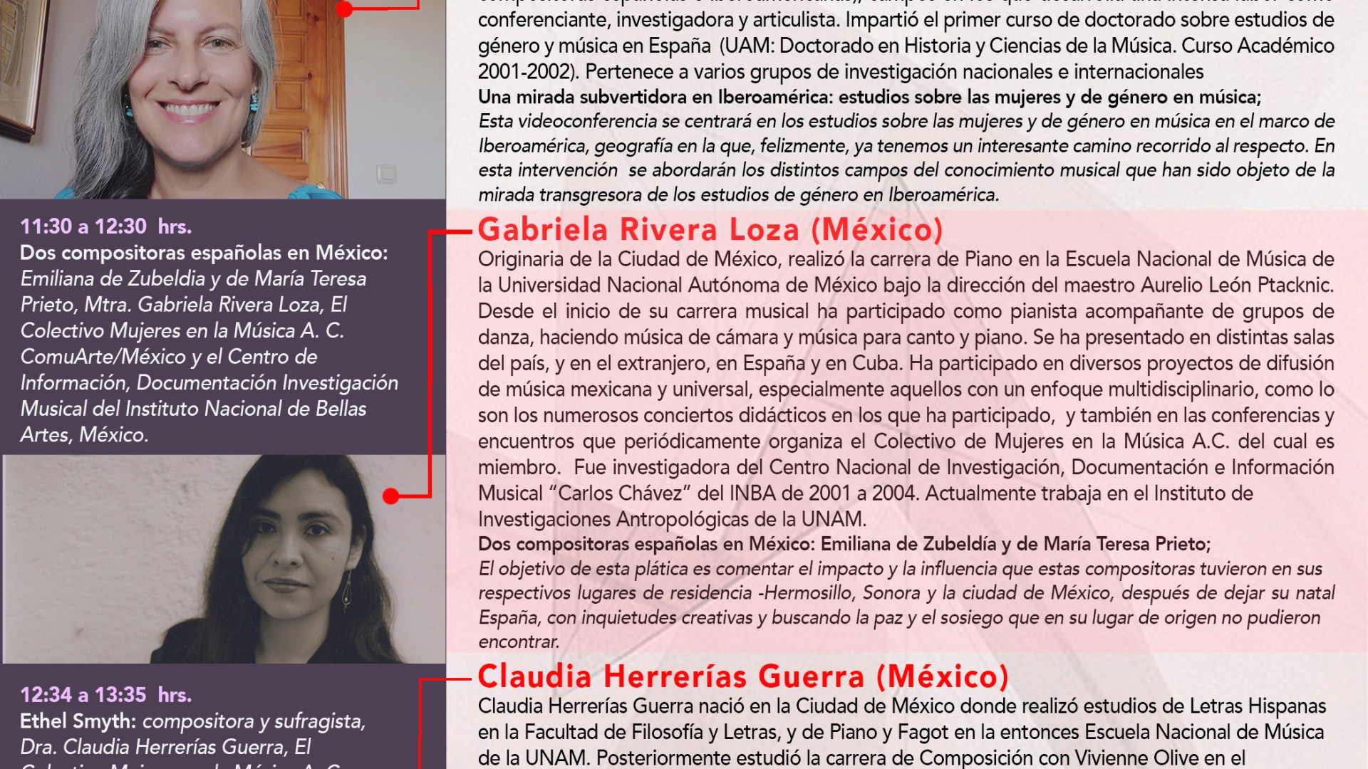 11:30 a 12:30 Dos compositoras españolas en México: Emiliana de Zubeldia y de María Teresa Prieto, Mtra. Gabriela Rivera Loza, El Colectivo Mujeres en la Música A. C. ComuArte/México y el Centro de Información, Documentación Investigación Musical del Instituto Nacional de Bellas Artes, México.