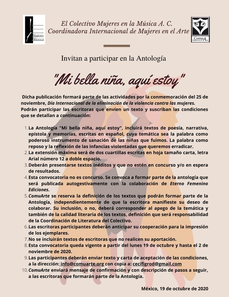 1. La Antología Mi bella niña, aquí estoy, incluirá textos de poesía, narrativa, epístola y memorias, escritas en español, cuya temática sea la palabra como poderoso instrumento de sanación de las niñas que fuimos. La palabra como el reposo y la reflexión de las infancias violentadas que queremos erradicar.