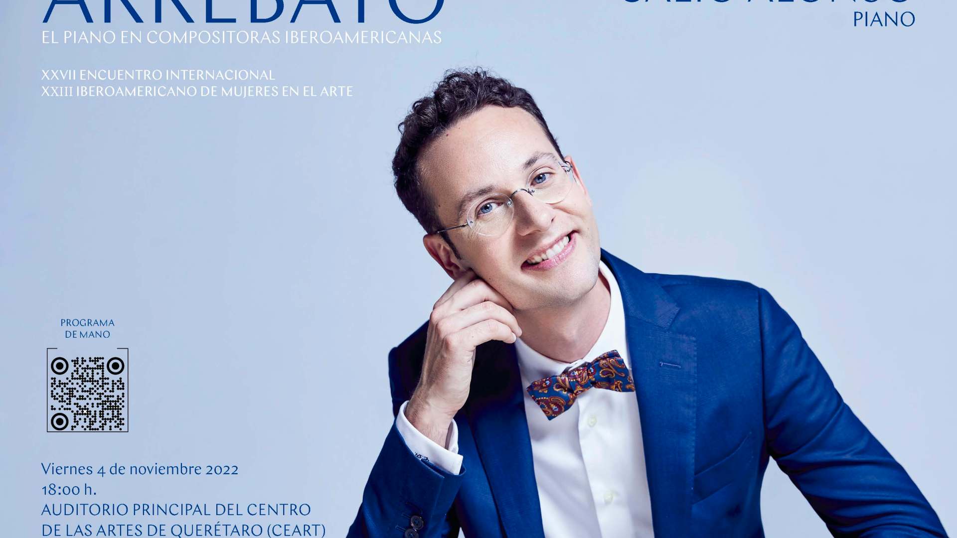 Presentación del programa del recital titulado «Arrebato»; sugerente viaje por América latina y España, en distintos momentos en el espacio y sus lenguajes, a través de una selección de obras para piano escritas únicamente por compositoras iberoamericanas universales (universal entendido como común a todos los tiempos y espacios) fuera de cualquier convención de su propio tiempo. Una propuesta que da voz a la pasión de anhelos y revoluciones de una pléyade en busca de la conquista de un espacio arrebatado.