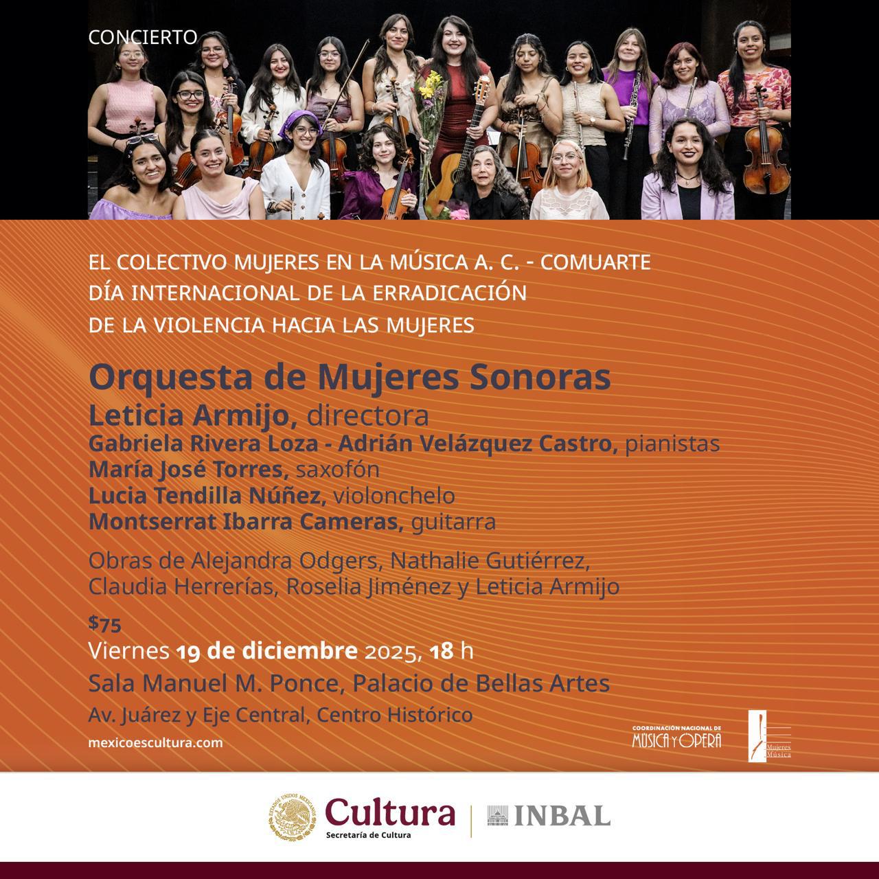 El primero, se llevará a cabo en la Sala Manuel M. Ponce del Palacio de Bellas Artes, el viernes 19 de diciembre a las 18:00 hrs. Participarán el dúo de pianistas integrado por Gabriela Rivera Loza, Adrián Velázquez y la Orquesta de Mujeres Sonoras con la saxofonista María José Torres, la violoncelista Lucía Tendilla Núñez y la guitarrista Montserrat lbarra Cameras como solistas. Obras de Obras de Alejandra Odgers, Nathalie Gutiérrez, Claudia Herrerías, Roselia Jiménez Pérez y Leticia Armijo. La entrada tiene un costo de $ 75.00 pesos.