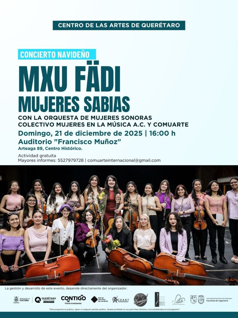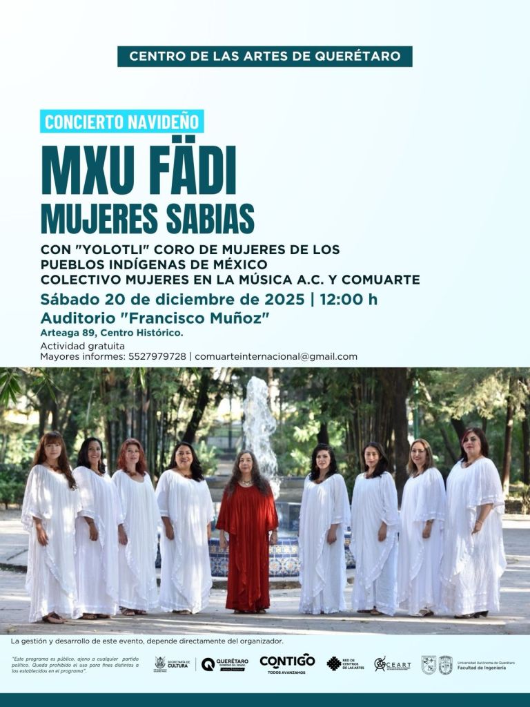 El magno evento concluirá con sendos conciertos navideños titulados “Mxu fädi” Mujeres sabias, con la participación de Yolotli, Coro de Mujeres de los Pueblos Indígenas de México y la Orquesta de Mujeres Sonoras, que dirigirá Leticia Armijo. La cita es el sábado 20 de diciembre a las 12:00 hrs. y domingo 21 a las 16:00 hrs. el Teatro Francisco Muñoz, del Centro de las Artes de Querétaro. La entrada es libre.